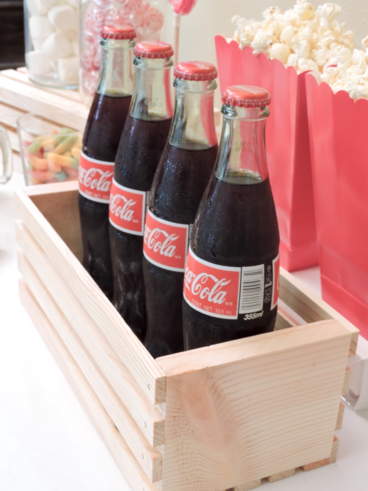 6. I like to add a few “out of the box” elements to my candy buffet such as old fashioned coca-colas or kettle corn in classic popcorn containers. Depending on your theme, pick one or two items that you wouldn’t think of as “strictly candy” but rather as “sweet things”. This really takes your candy buffet to the next level.