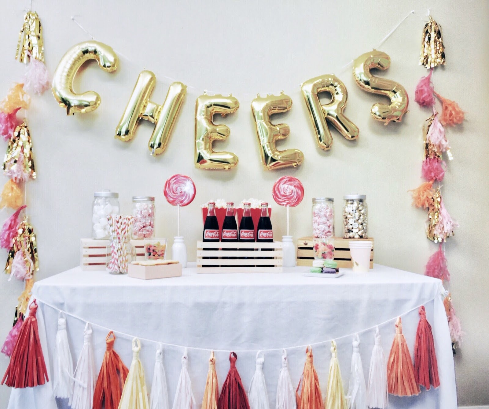 Cheers Balloon sign: Amazon // Side tassels: Target (I combined the gold tassels with the pink & orange tassels) // Tassels on front of table: Target // Crates: Walmart // Glass Jars: Ikea (similar) // Lollipops: Whirly Pop // Blush Cups: Oh Happy Day // Popcorn Boxes: Party City // Milk Bottles: Bed Bath & Beyond // Paper Straws: Party City // Candy Glasses: Ikea