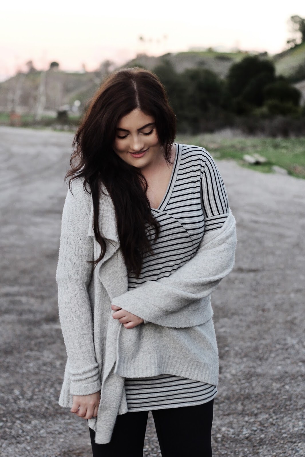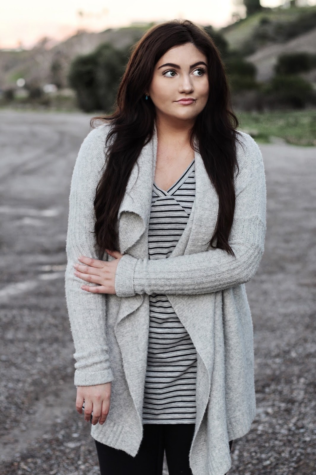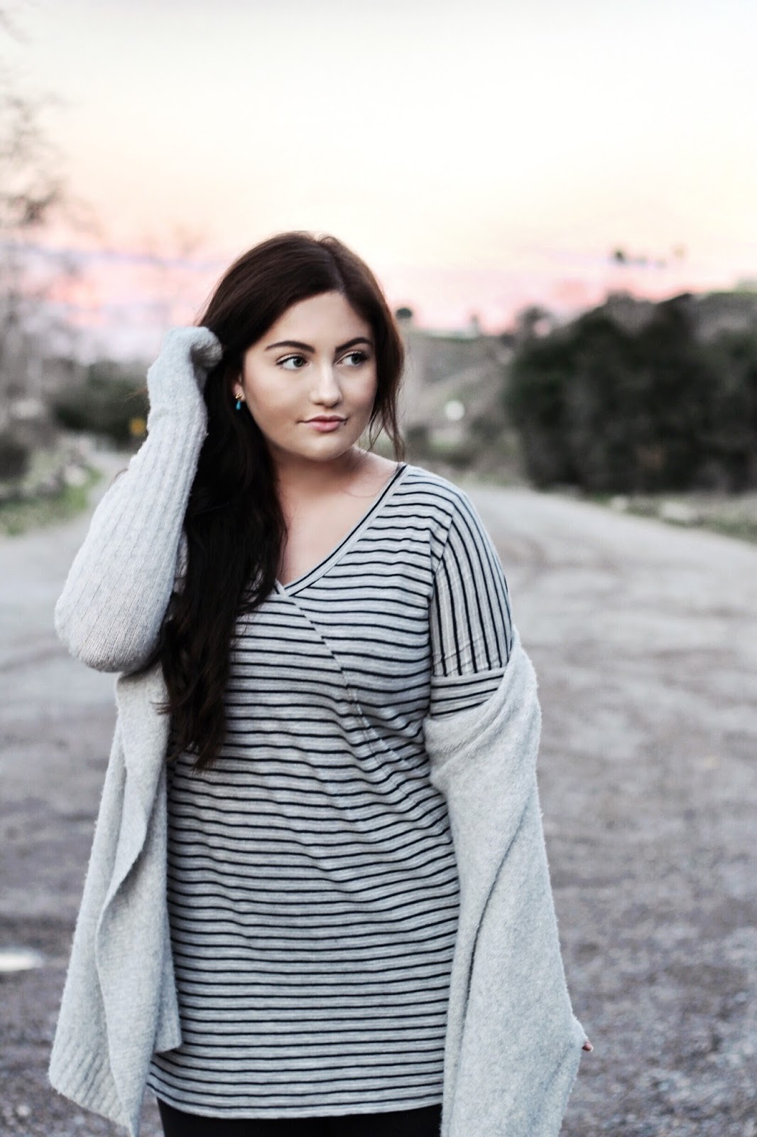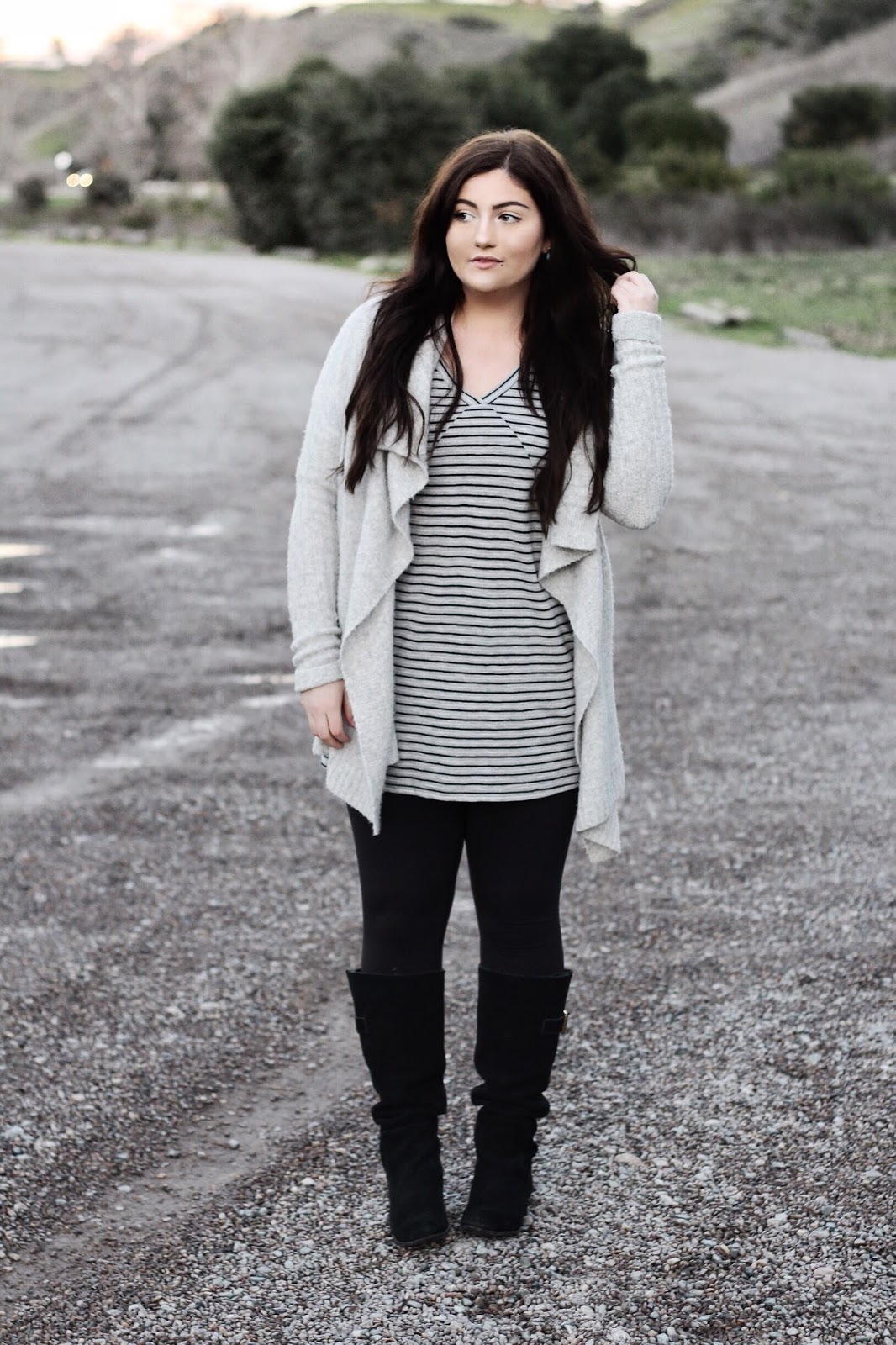 Grey is my go-to color for any occasion, season or mood. Half of my closet is probably filled with varying shades of grey dresses, tops, sweaters and bags. I’ve been especially loving monochromatic outfits lately in beige, blush, creams and of course greys and with all the grey I have in my closet what better way to make use of it than to create a monochrome outfit! For a Saturday night of grabbing some dinner and catching a movie, I paired a comfy striped t-shirt dress with a cozy grey cardigan and black suede boots.