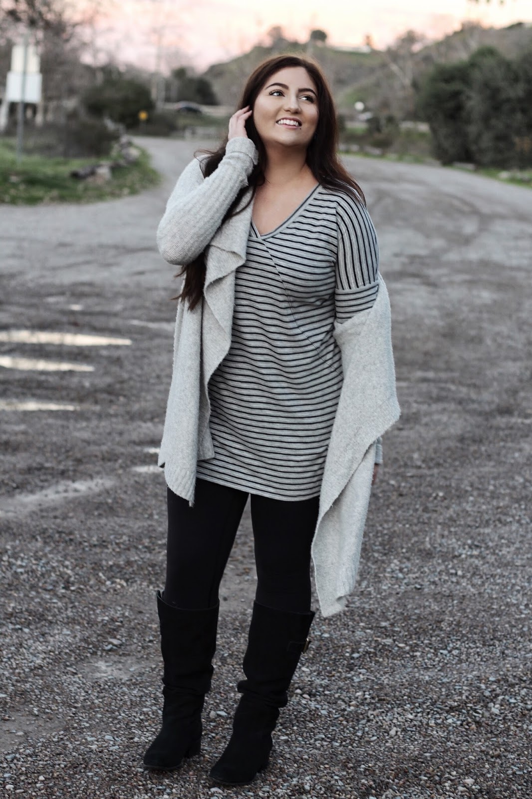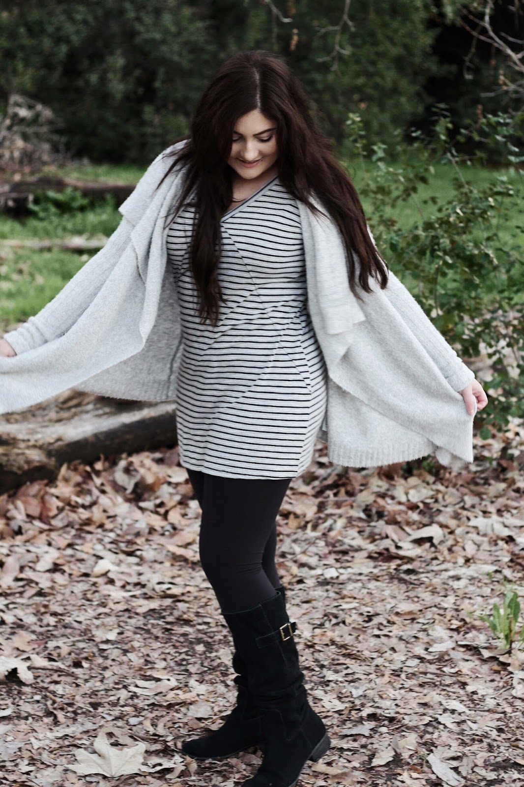 Grey is my go-to color for any occasion, season or mood. Half of my closet is probably filled with varying shades of grey dresses, tops, sweaters and bags. I’ve been especially loving monochromatic outfits lately in beige, blush, creams and of course greys and with all the grey I have in my closet what better way to make use of it than to create a monochrome outfit! For a Saturday night of grabbing some dinner and catching a movie, I paired a comfy striped t-shirt dress with a cozy grey cardigan and black suede boots.