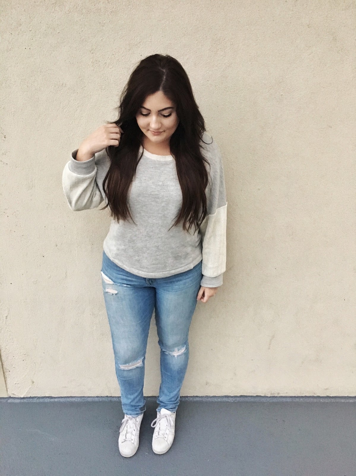 I buy all my jeans from Abercrombie and I’ve turned friends and family onto their awesome jeans too! They have so many different cuts, shades and styles, you’re sure to find a pair that is great for you (and not too pricey either). I also want to share this cozy and comfy pullover sweater from Anthropologie. It is two toned grey and cream so it can be paired with beiges and warm tones or with greys and cool tones. And of course no comfy outfit is complete without cute sneakers, I love pairing my white adidas with almost any casual outfit.