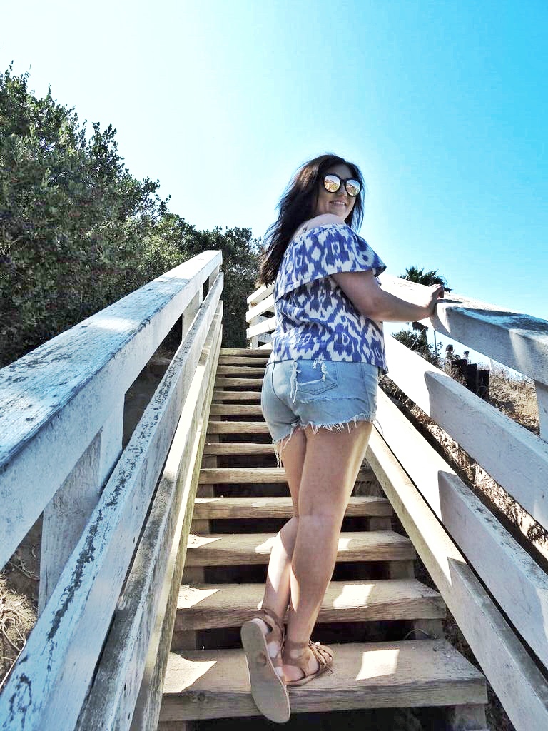 My absolute favorite trend right now is off the shoulder tops! For this beach day I wore my favorite top of the moment from Madewell paired with destroyed denim shorts and suede gladiator sandals.